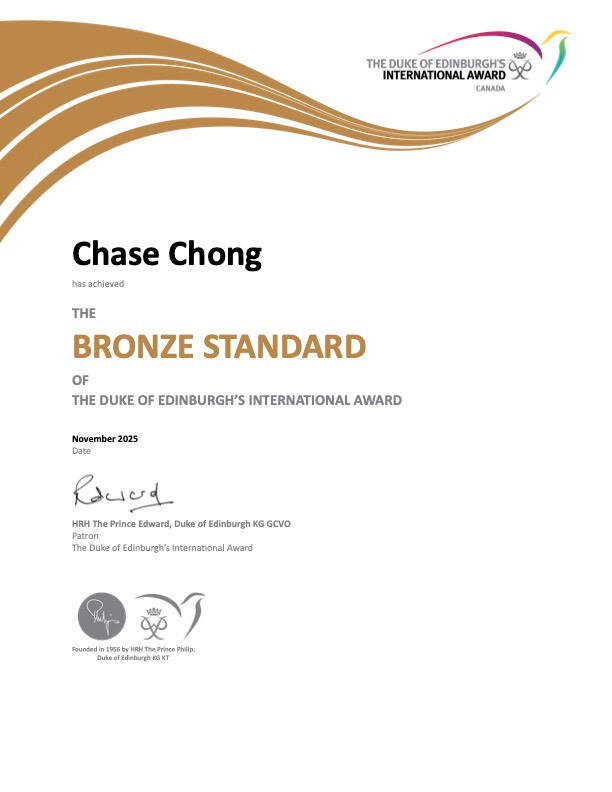 Born in Canada in 2009, Chase Chong is a warm-hearted and quietly determined student who finds purpose in helping others through learning and kindness. Now in Grade 11, Year One of the International Baccalaureate Diploma Programme at Sir Winston Churchill Secondary School, Chase hopes to pursue a future in medical science, a field where his curiosity for biology and his desire to make a meaningful difference come together.Since childhood, Chase has been deeply involved in music, sport, and community service. When a serious leg injury in Grade 7 forced him to pause his athletic pursuits and brought his competitive path to an end, he chose resilience over retreat. He redirected his energy towards service and learning, earning certifications in Standard First Aid, National Lifeguard, Swimming Instructor, and Lifesaving Instructor. Now a Junior Leader at the Percy Norman Swim Club, he assists to teach younger swimmers and promotes water safety, while continuing to perform piano in charity concerts for local hospitals. Through these experiences, Chase has come to understand that healing is not only physical, but also emotional. His years as a pianist have shown him how music connects people across backgrounds, brings calm in difficult moments, and supports overall well-being, values he hopes to carry into medicine.Alongside these commitments, Chase has taken the initiative to engage in in-depth conversations and job-shadowing experiences with medical professionals, including his family physician, paediatrician, physiotherapist, dentist, optometrist, pharmacist, and a speech-language pathologist, in order to better understand the realities of healthcare. These experiences have shown him that medicine is not glamorous, but deeply human: it is built on service, knowledge, responsibility, and trust. Inspired by their honesty and shaped by their compassion, Chase hopes one day to contribute to this profession with the same integrity and empathy.Chase believes that a meaningful life is not measured by awards or prestige, but by the quiet ways one uplifts others, whether through music, through service, or, one day, through medicine.